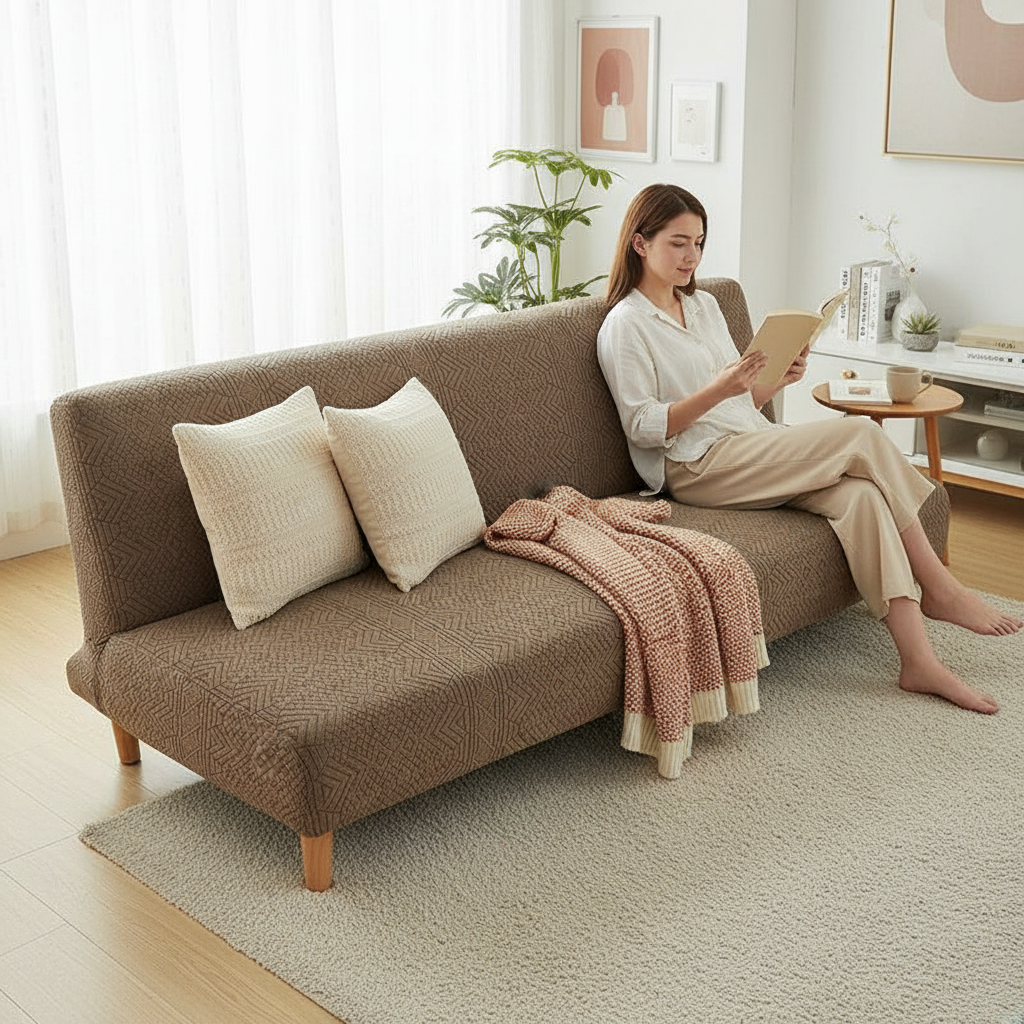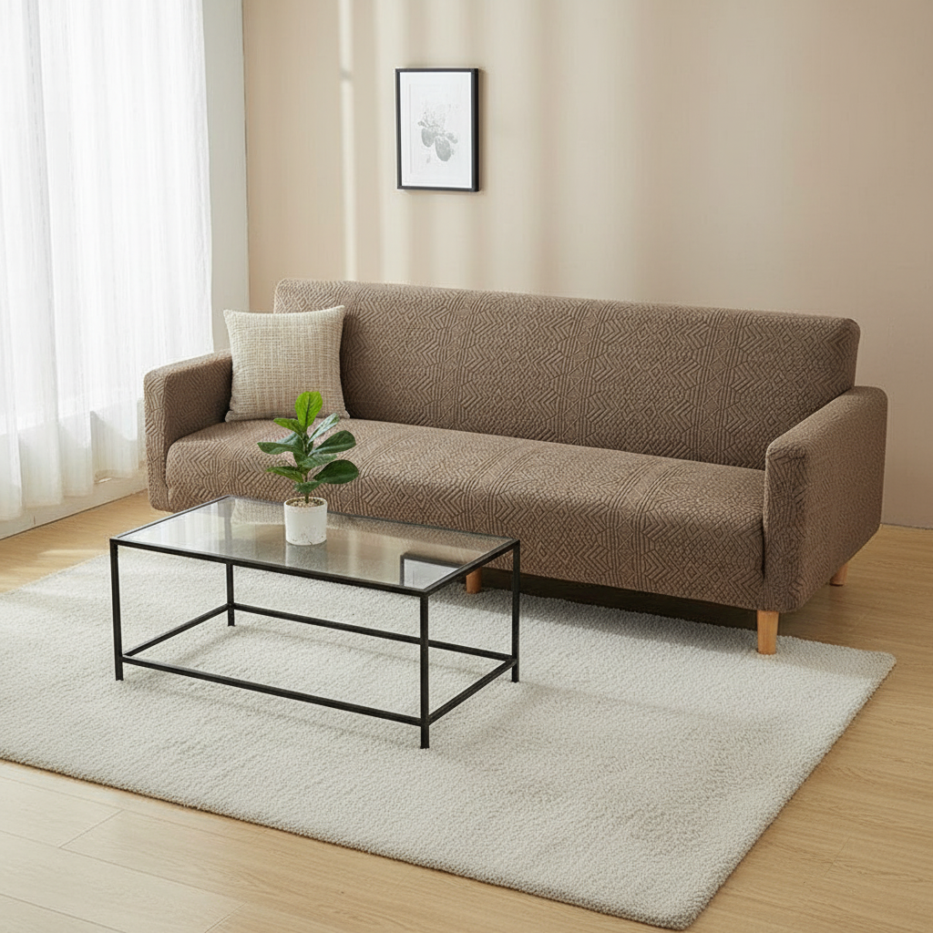 Transformez instantanément votre futon ou canapé-lit avec notre housse de clic-clac taupe clair, conçue pour allier esthétique et confort. Son tissu jacquard tricoté, doux et extensible, apporte une touche d'élégance discrète et protège votre mobilier au quotidien. Idéale pour les saisons fraîches, elle crée une ambiance chaleureuse dans votre intérieur.Caractéristiques & compatibilités