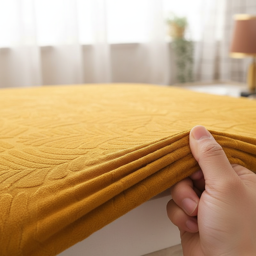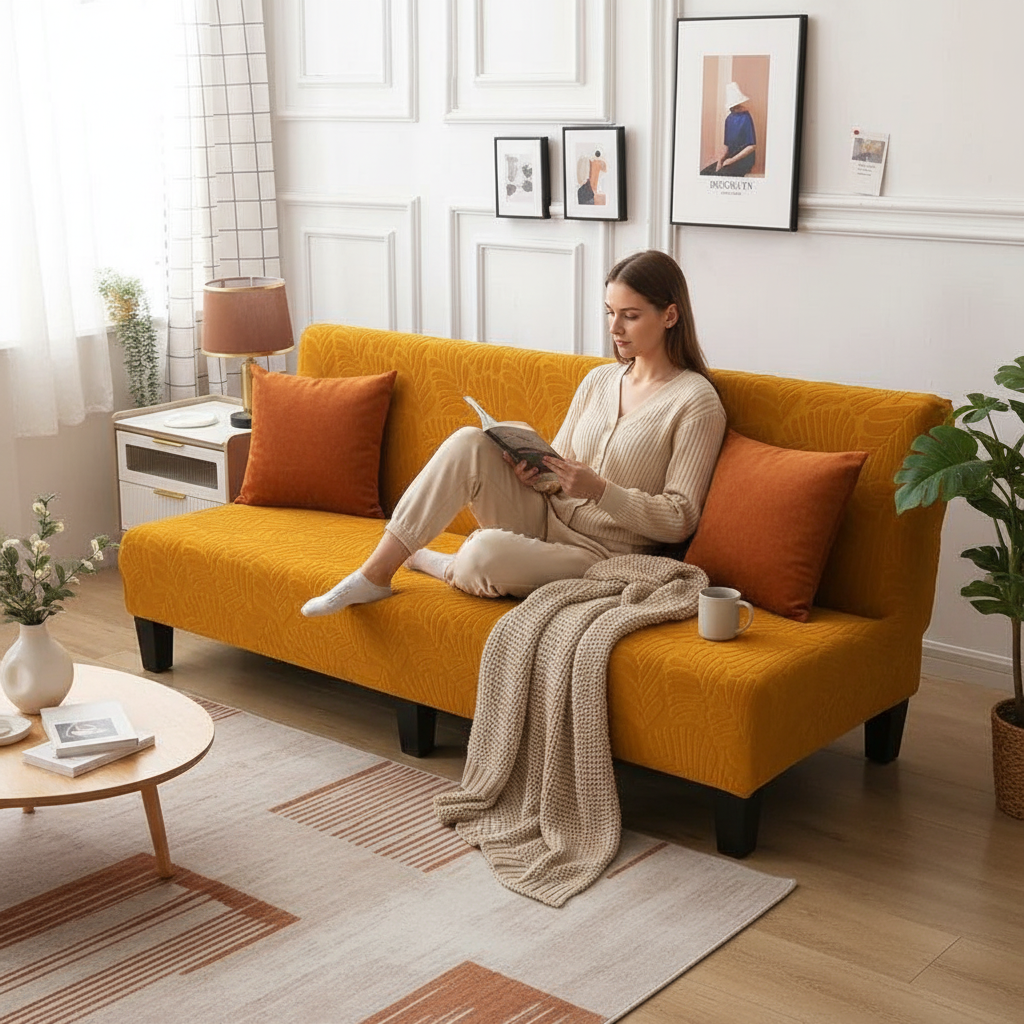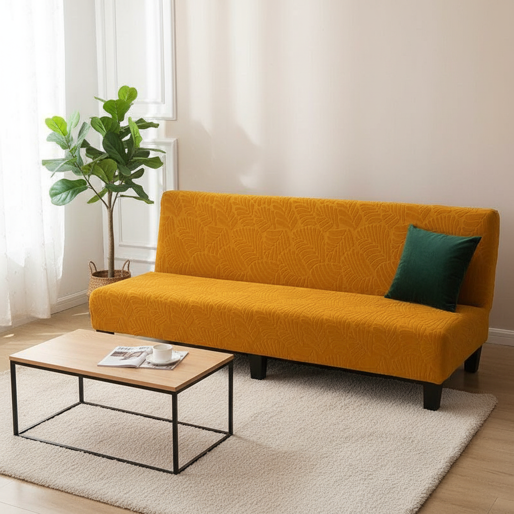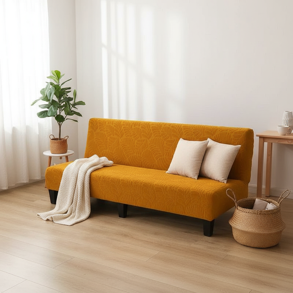 Transformez l'ambiance de votre intérieur avec notre housse de clic-clac extensible, arborant un motif jacquard feuilles ocre. Conçue en 95% polyester et 5% spandex, cette housse de haute qualité offre une douceur et un confort exceptionnels, tout en protégeant efficacement votre mobilier.