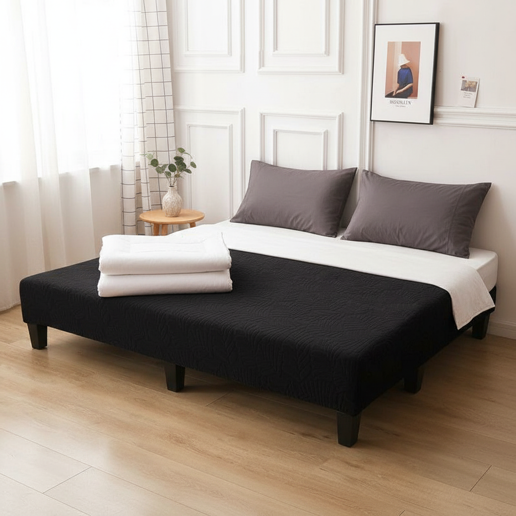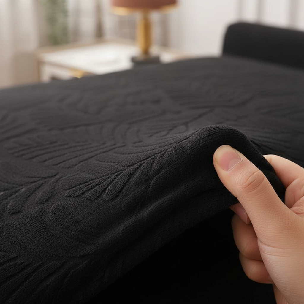 Transformez l'esthétique de votre salon avec notre housse de clic-clac noire, ornée d'un élégant motif jacquard feuilles. Conçue en 95% polyester et 5% spandex, cette housse extensible offre une protection complète tout en apportant une touche de sophistication et de confort à votre canapé-lit.