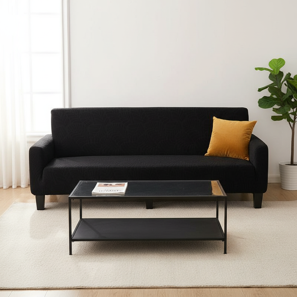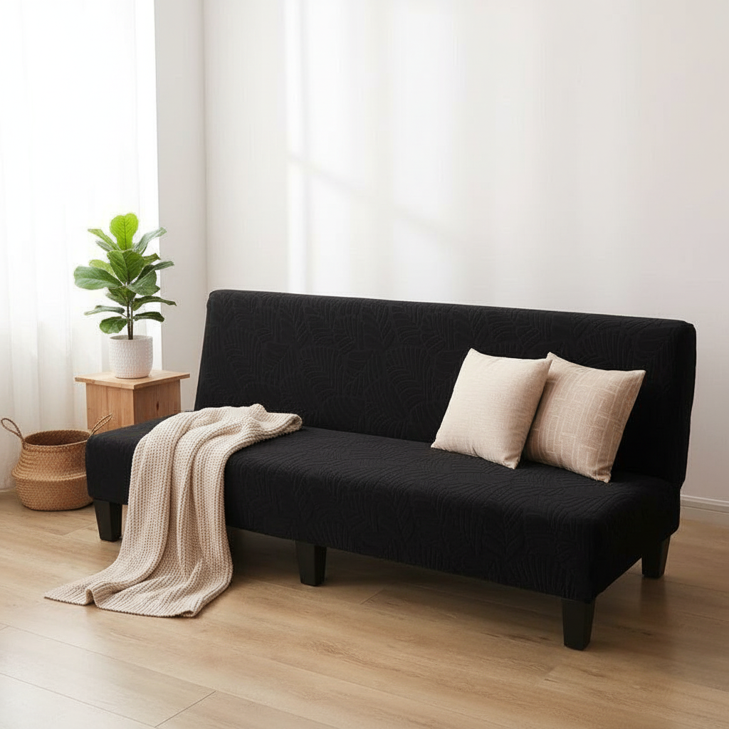Housse de clic-clac noire jacquard feuilles pour canapé sans accoudoirs