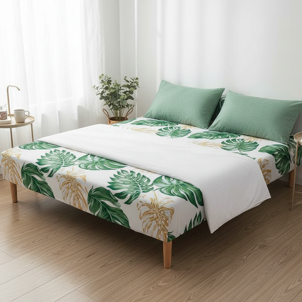 - Motif géométrique tropical vert et or, apportant une ambiance chaleureuse.