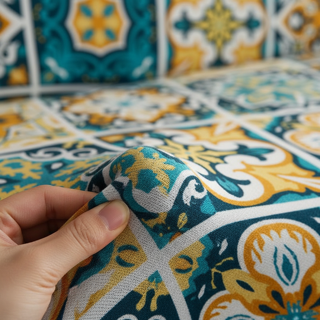 - Design unique : Motifs géométriques type mosaïque bleu et jaune, au style brossé.