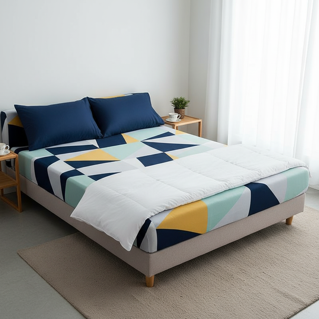 - Style : Motifs géométriques contemporains aux couleurs vives (bleu marine, menthe, jaune, blanc) pour dynamiser votre espace.