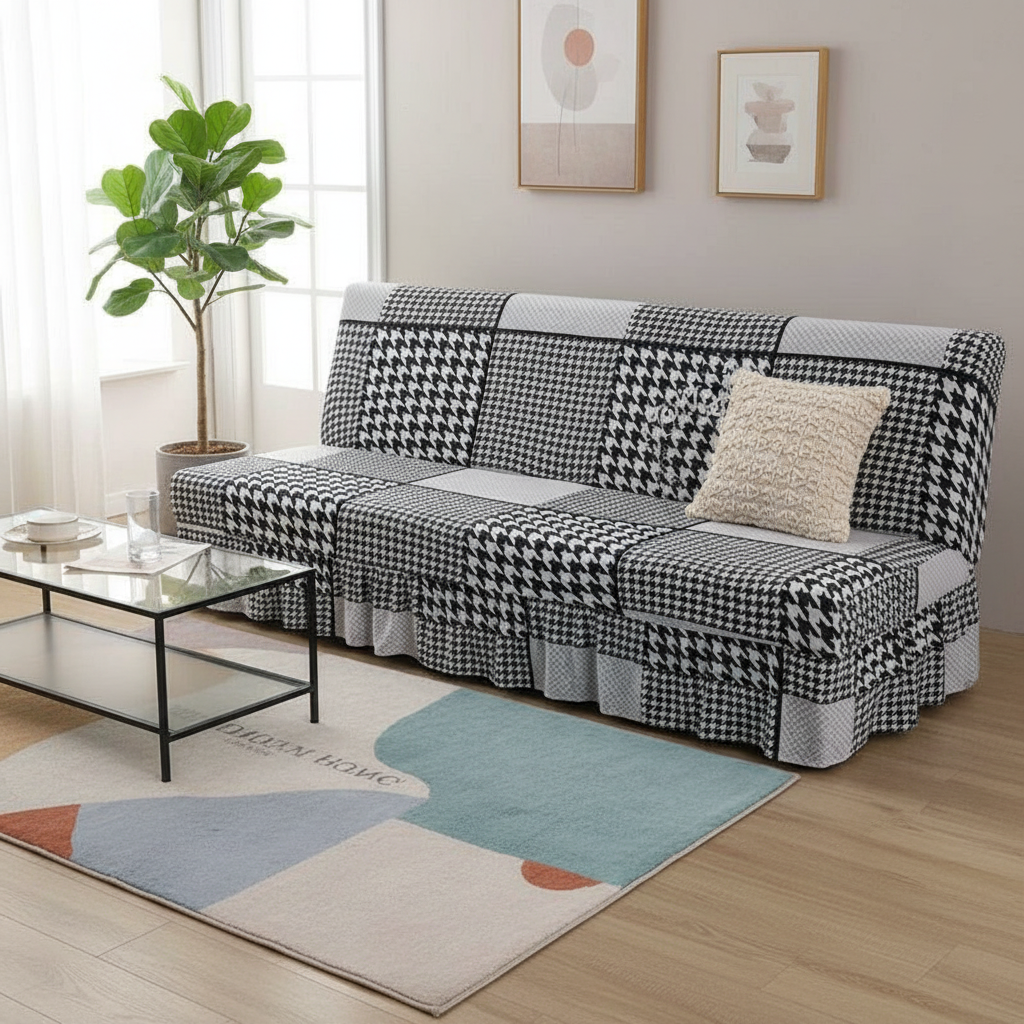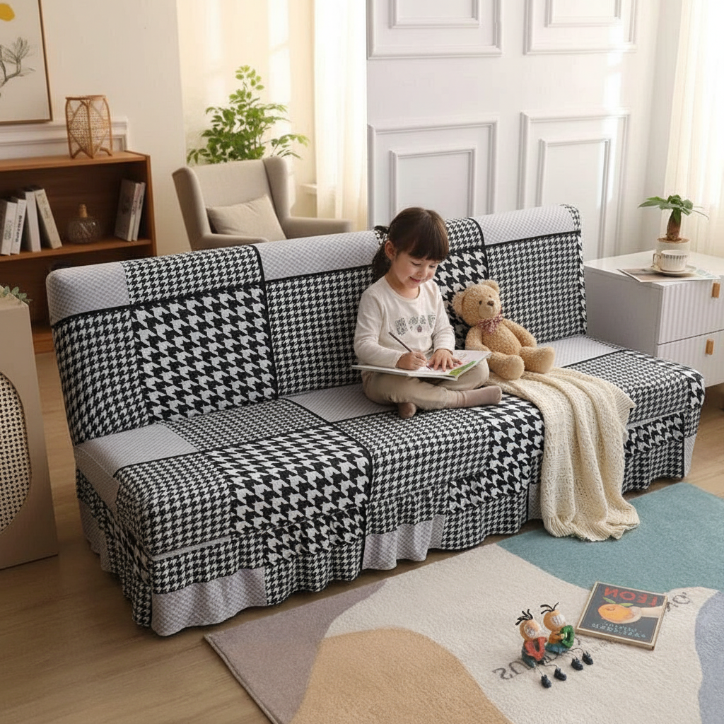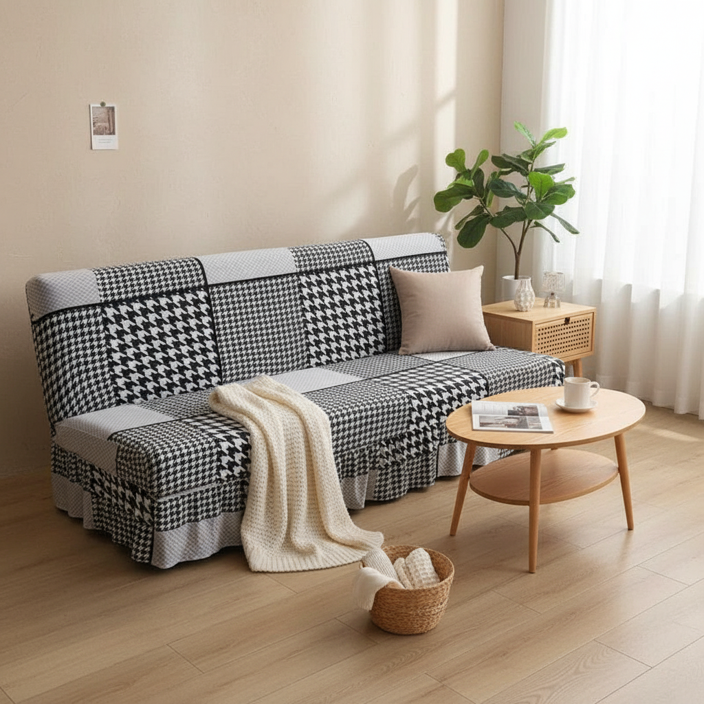 Transformez instantanément votre canapé-lit avec notre housse de clic-clac en polyester, arborant un élégant motif géométrique pied-de-poule. Grâce à sa conception tricotée et extensible, elle épouse parfaitement les formes de votre meuble, offrant une nouvelle jeunesse à votre intérieur. Sa jupe ajoute une touche de raffinement, idéale pour harmoniser votre salon.