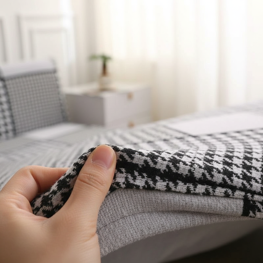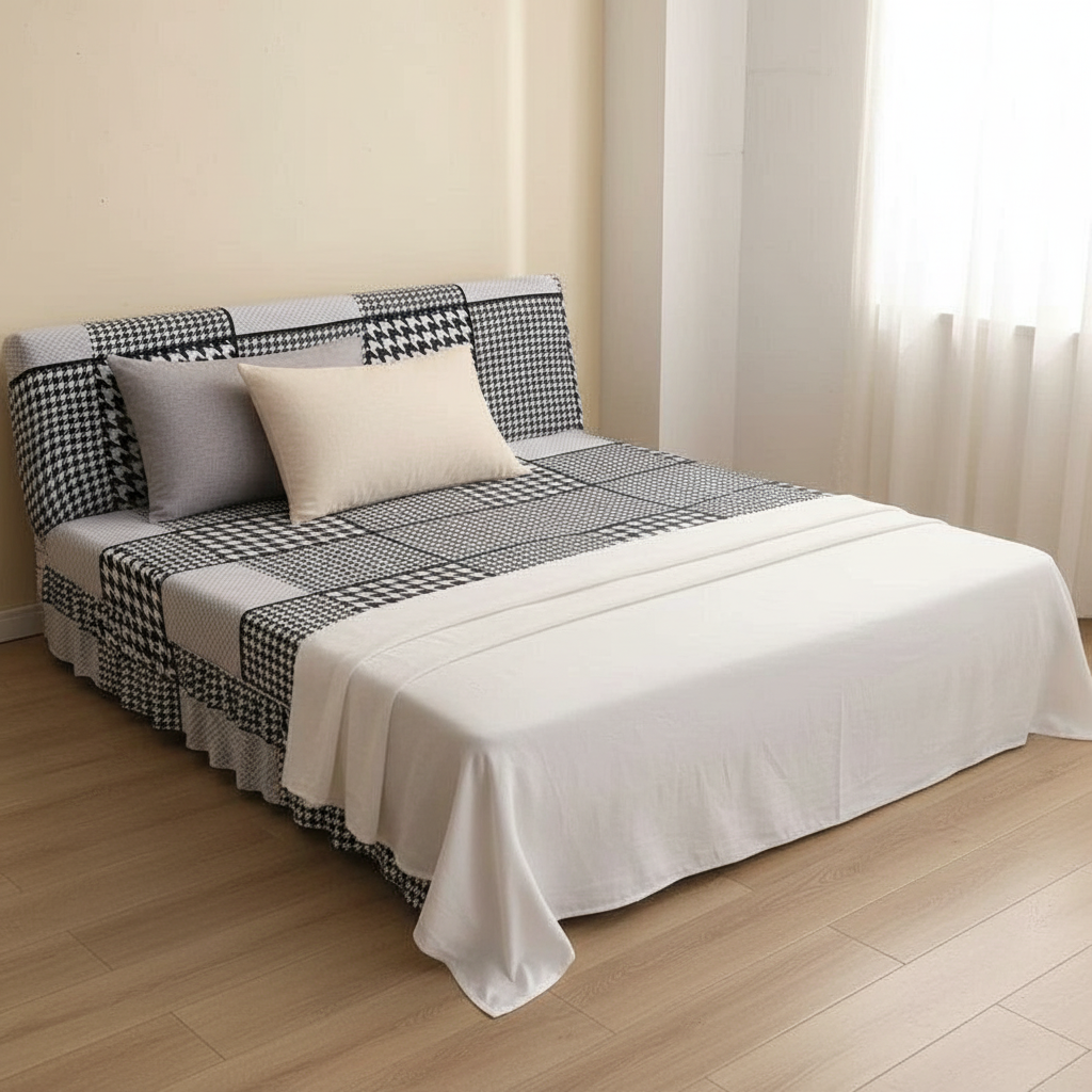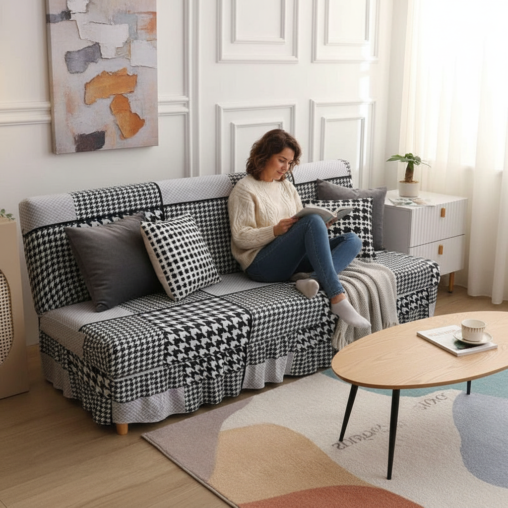 Transformez instantanément votre canapé-lit avec notre housse de clic-clac en polyester, arborant un élégant motif géométrique pied-de-poule. Grâce à sa conception tricotée et extensible, elle épouse parfaitement les formes de votre meuble, offrant une nouvelle jeunesse à votre intérieur. Sa jupe ajoute une touche de raffinement, idéale pour harmoniser votre salon.