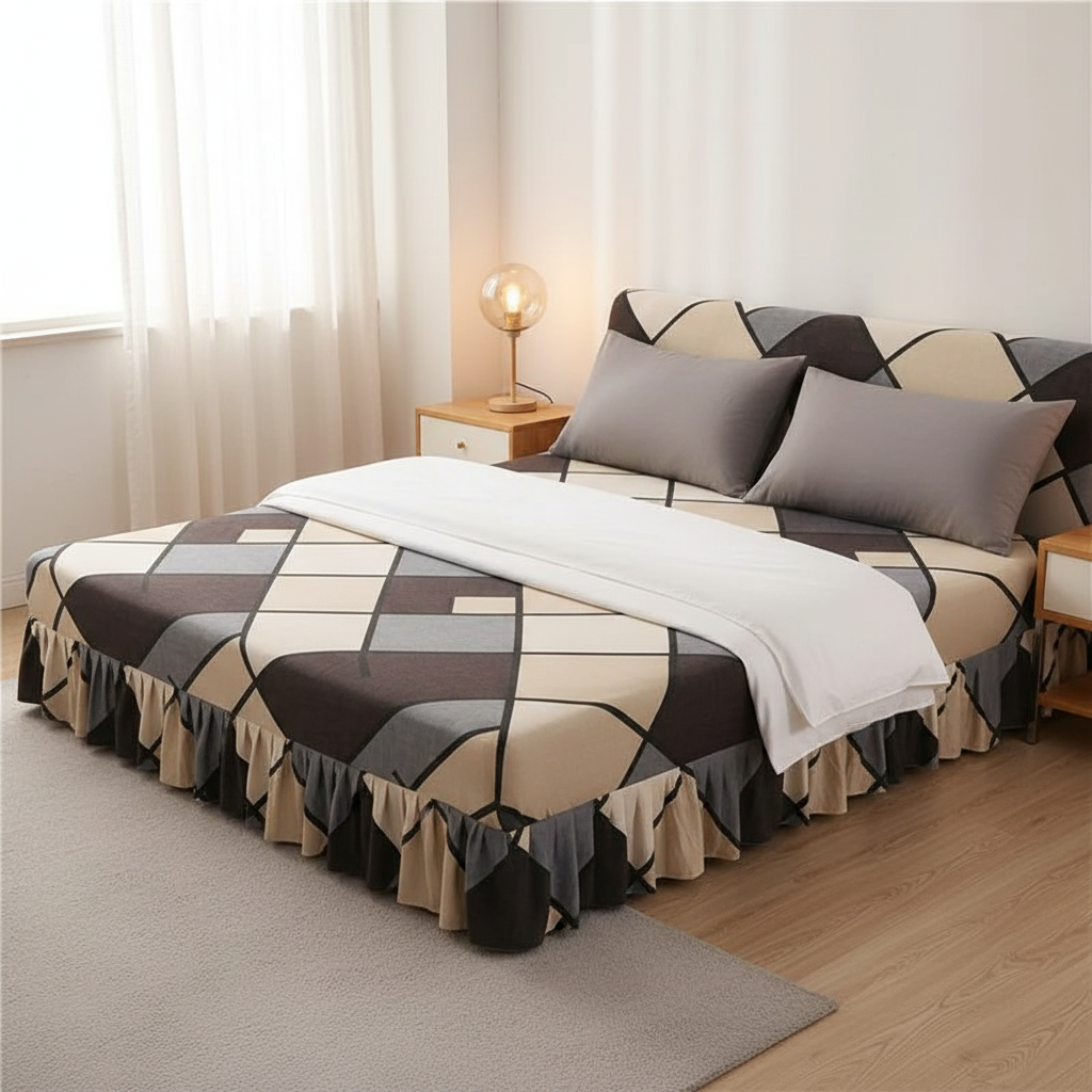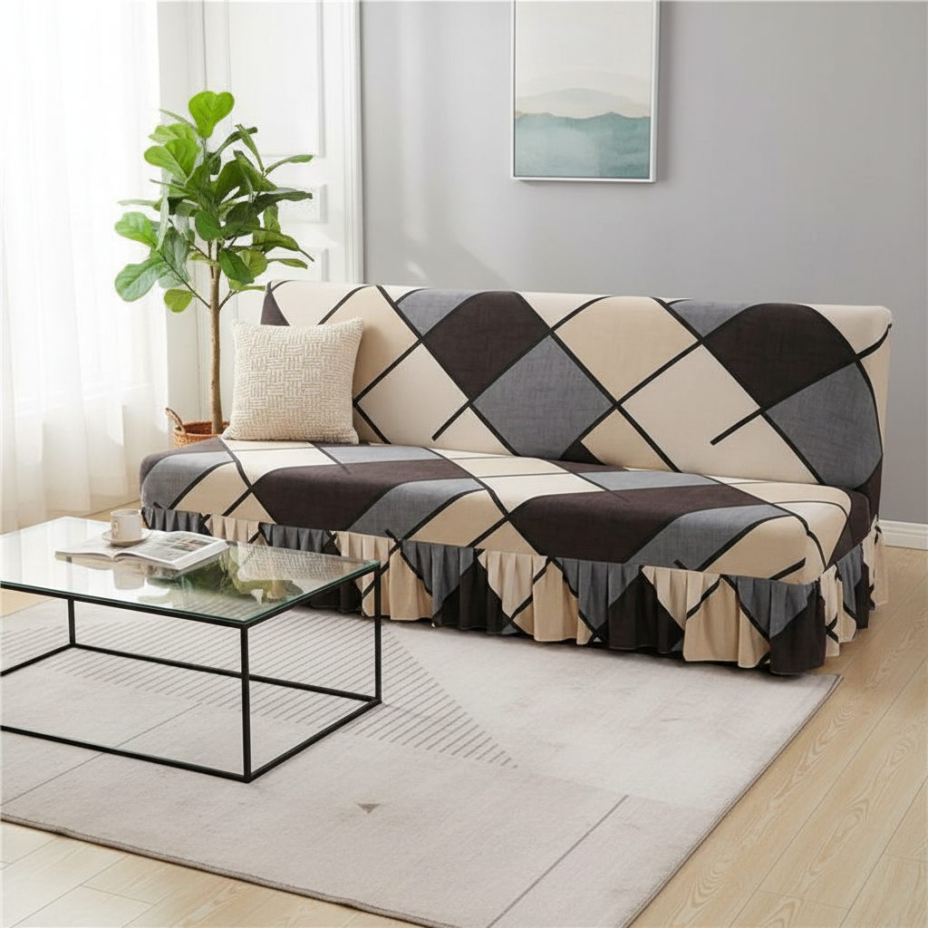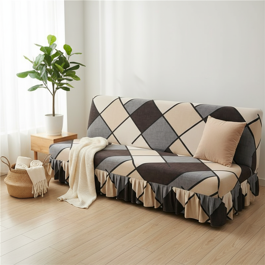Transformez l'ambiance de votre salon avec notre housse de clic-clac aux motifs losanges beiges et marrons. Conçue en polyester tricoté de haute qualité (140 g/m²), elle offre une protection intégrale et un style géométrique moderne à votre canapé-lit.
