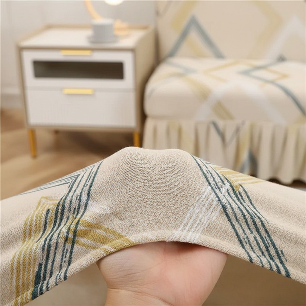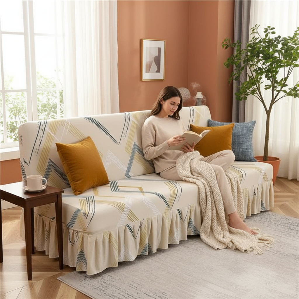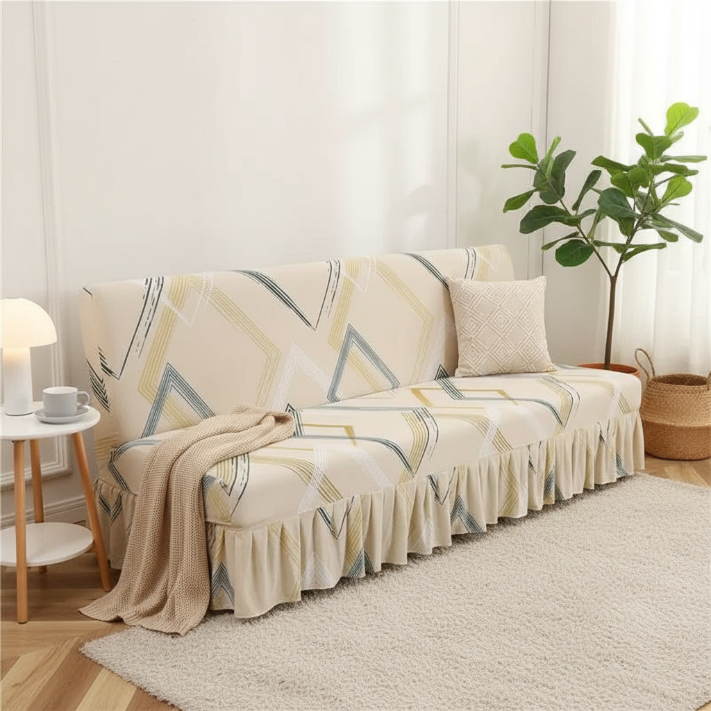 Transformez l'ambiance de votre salon avec notre housse de clic-clac en polyester tricoté, alliant protection et esthétique. Son motif géométrique moderne en beige, rehaussé d'un élégant volant, apporte une touche de fraîcheur et de sophistication à votre intérieur. Conçue pour une tenue impeccable, elle protège efficacement votre canapé-lit tout en étant facile à entretenir.