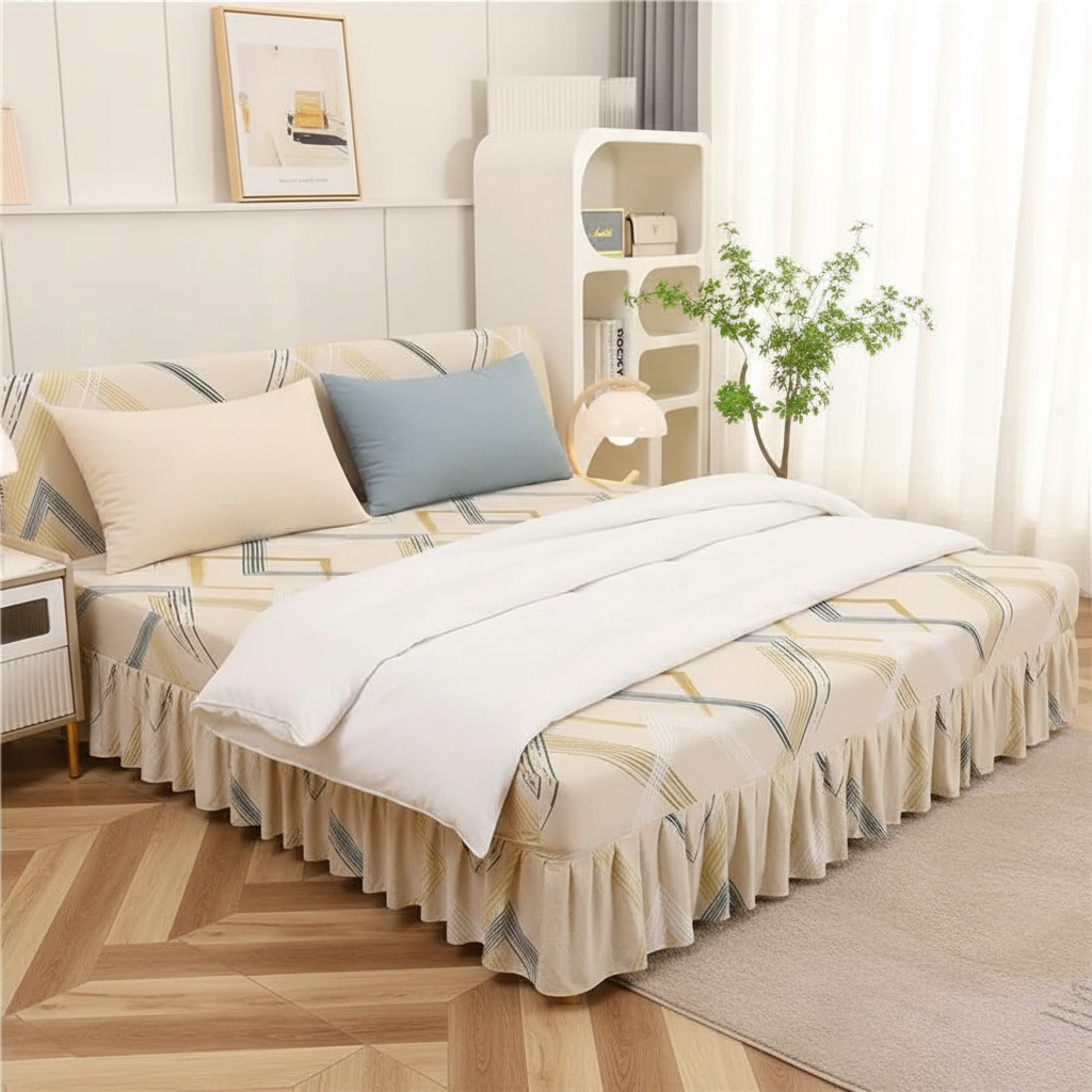 - Style distinctif : Motif géométrique contemporain et couleur beige douce avec un volant décoratif.
