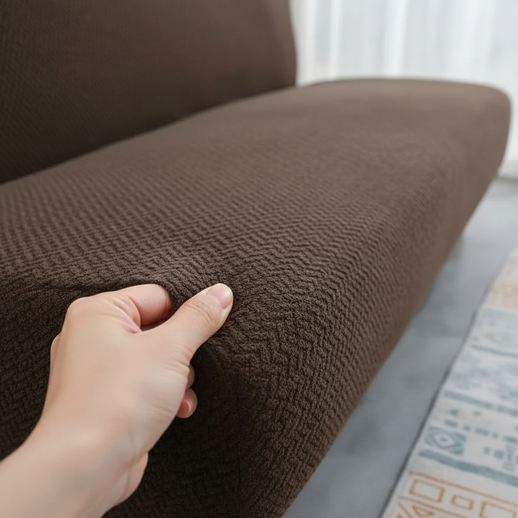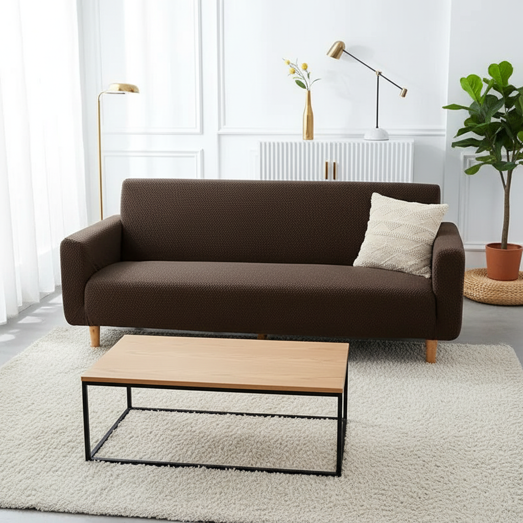 Transformez l'ambiance de votre intérieur avec cette housse de clic-clac marron, conçue en 100% polyester de 400 gsm. Son tissu hautement extensible offre une protection intégrale et un toucher doux et agréable, tandis que sa texture jacquard subtile apporte une touche d'élégance discrète à votre canapé-lit.