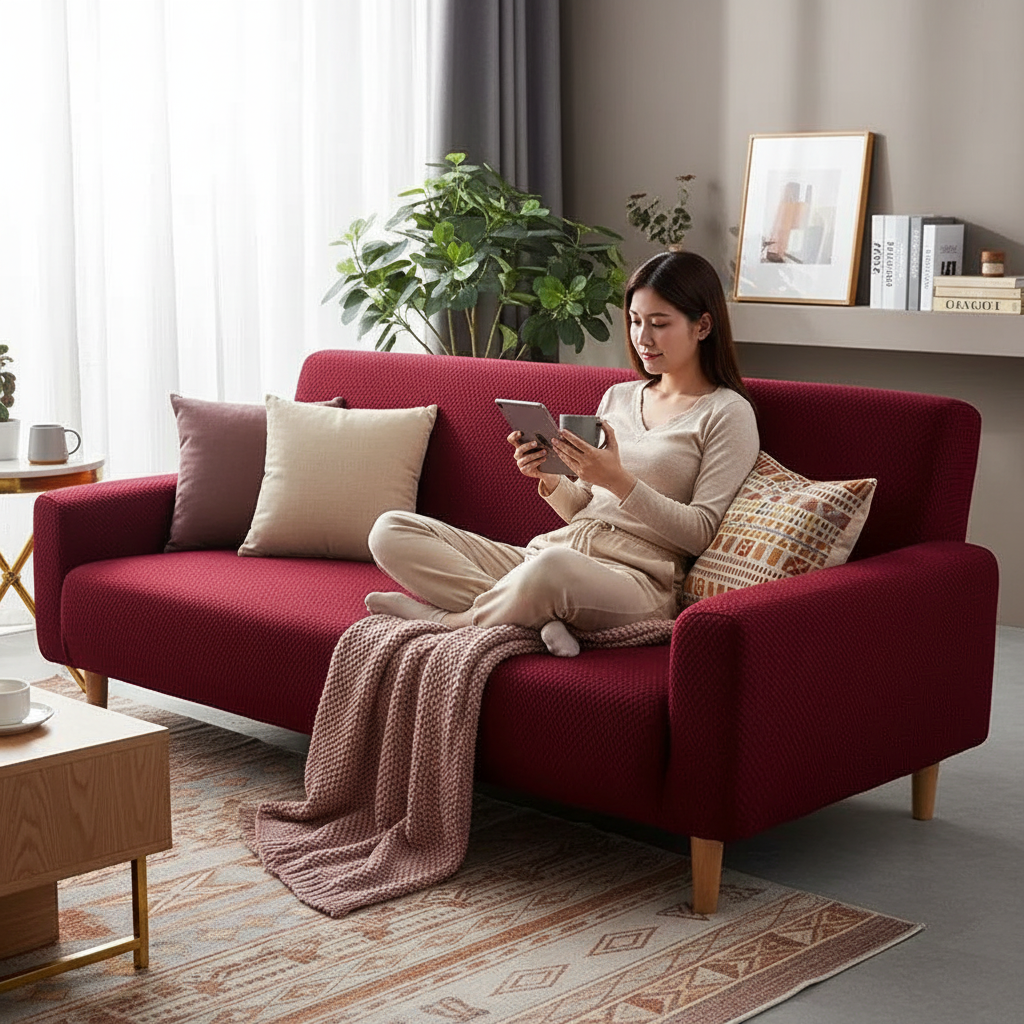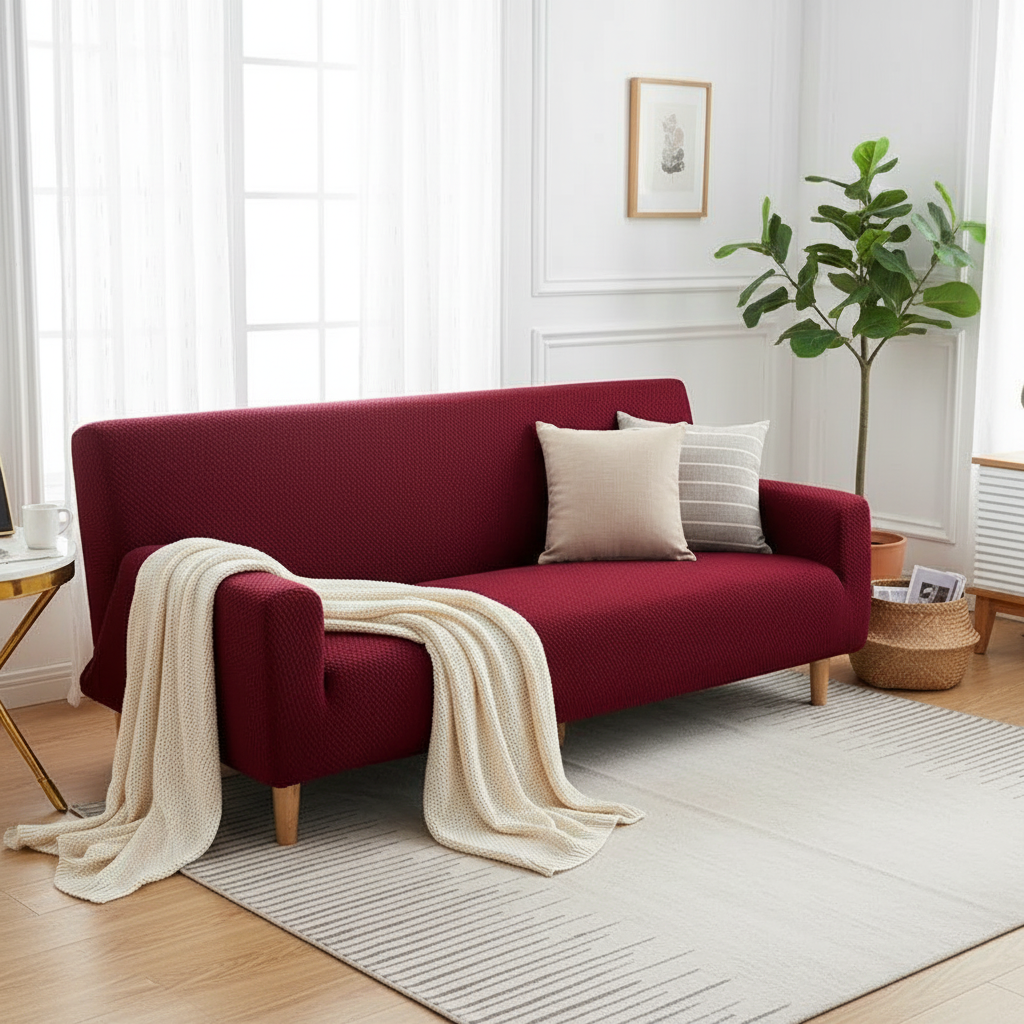 Offrez une nouvelle vie à votre canapé-lit avec notre housse de clic-clac jacquard Bordeaux. Confectionnée en 100% polyester à haute élasticité, elle épouse parfaitement les formes de votre meuble tout en apportant une touche d'élégance et de confort doux et agréable au toucher.