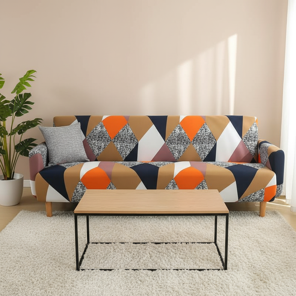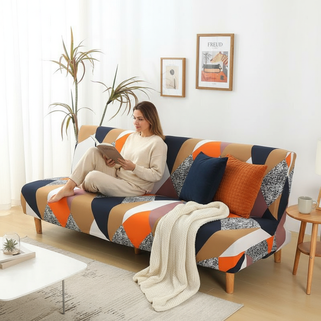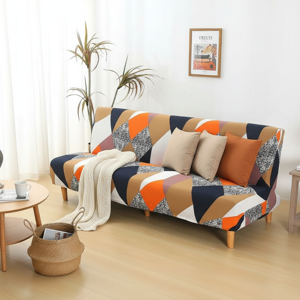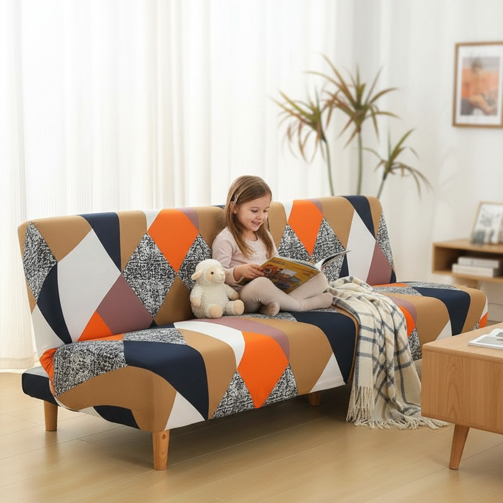 Transformez l'ambiance de votre salon avec notre housse de clic-clac aux motifs géométriques multicolores. Conçue en polyester tricoté de 150gsm, elle offre une solution élégante et durable pour rafraîchir ou protéger votre canapé-lit futon, apportant une touche de modernité et de couleur vive à votre intérieur.Caractéristiques & compatibilités