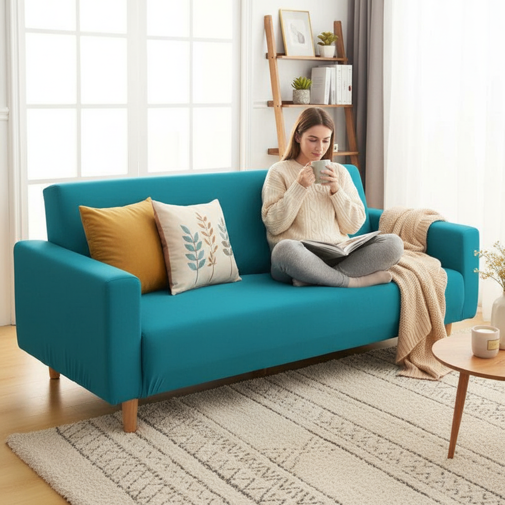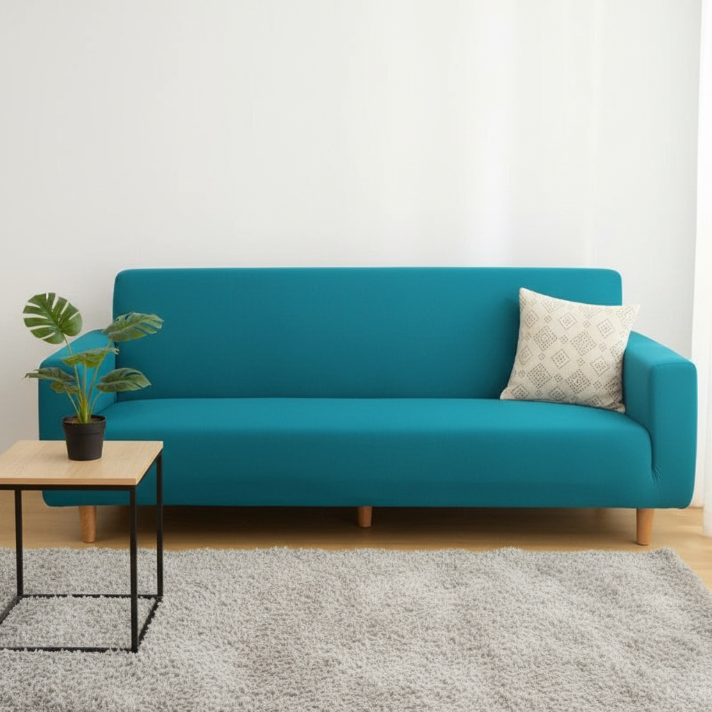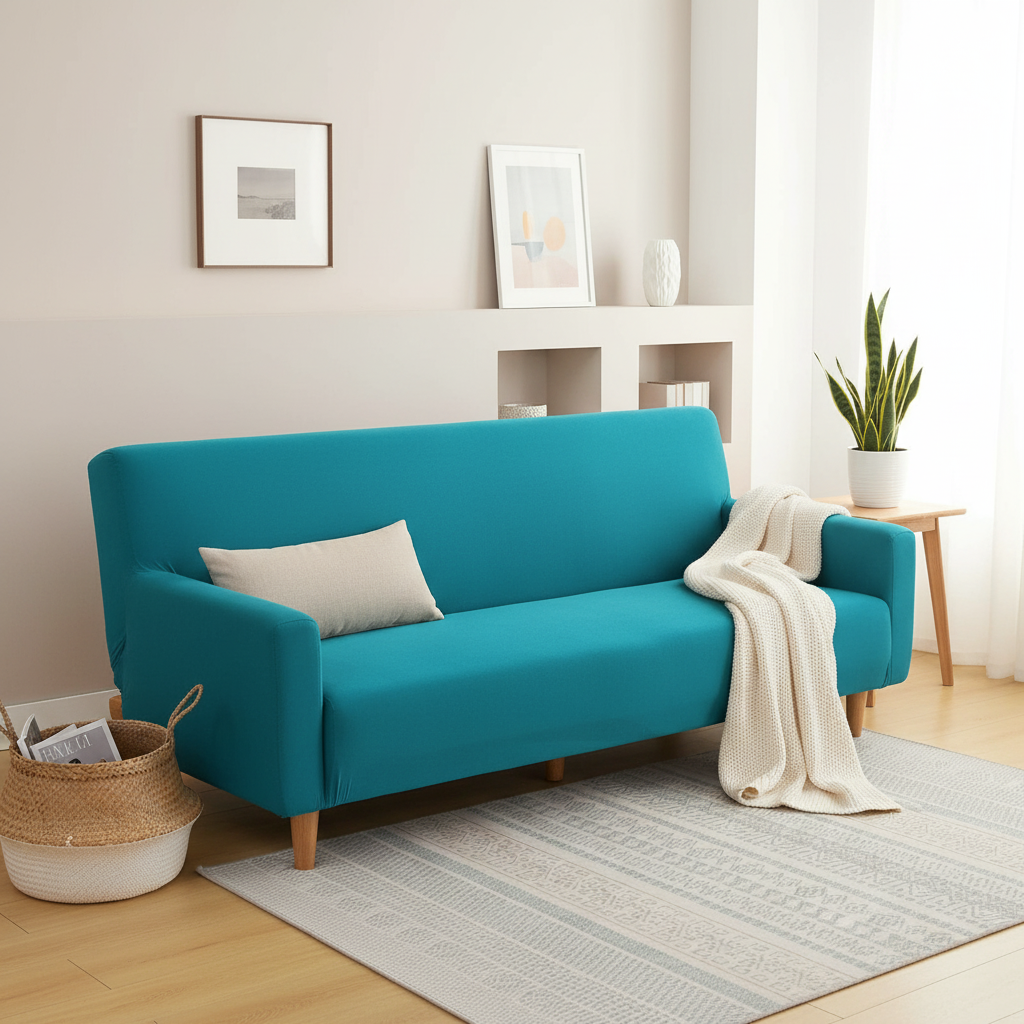 Transformez l'ambiance de votre salon avec notre housse de clic-clac turquoise unie. Confectionnée à partir d'un tissu extensible en 95% polyester et 5% spandex, elle offre une sensation douce et confortable tout en protégeant efficacement votre canapé-lit.