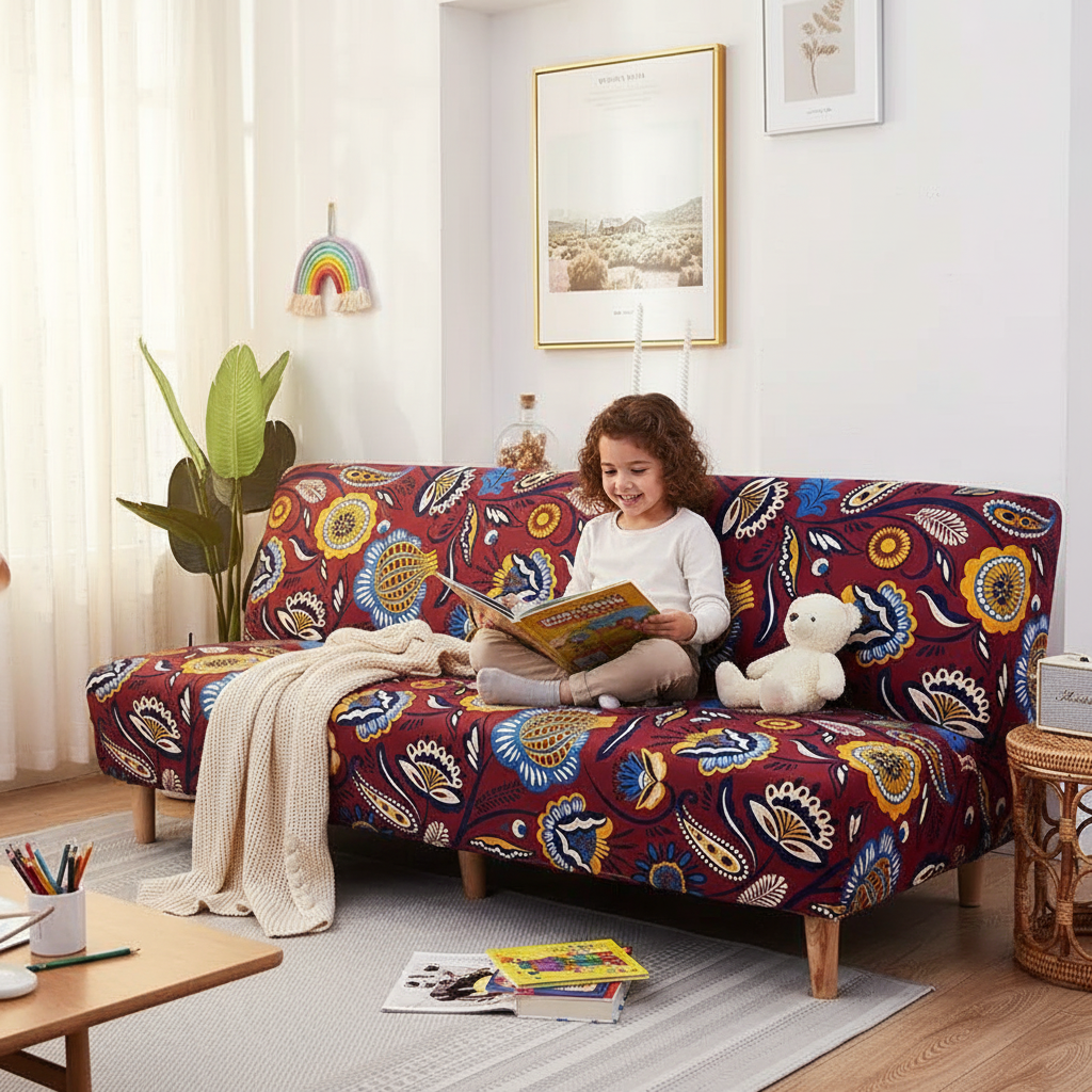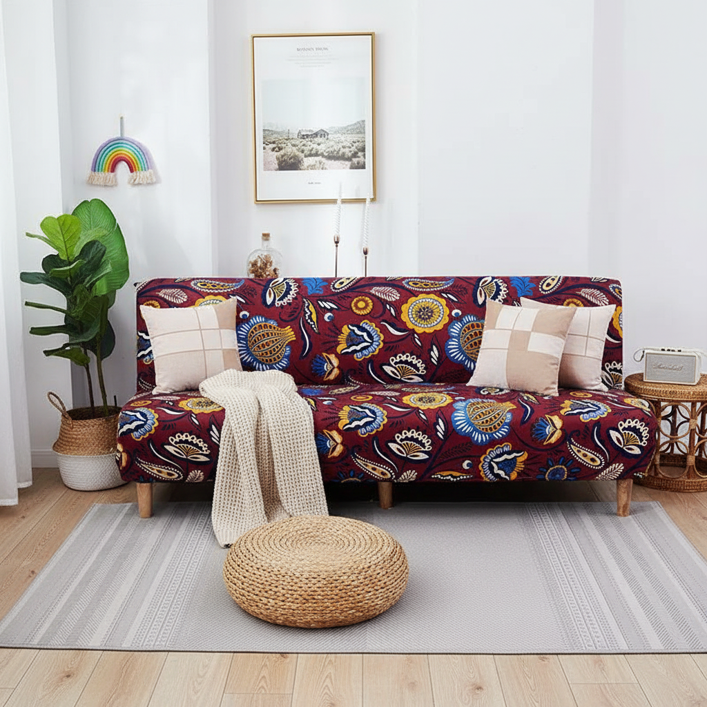 Transformez votre espace avec notre housse de clic-clac extensible, arborant un motif floral vibrant sur un fond bordeaux. Conçue en 100% polyester tricoté de 130 g/m², elle offre une protection complète et un toucher doux, idéale pour rafraîchir votre intérieur et le protéger au quotidien.