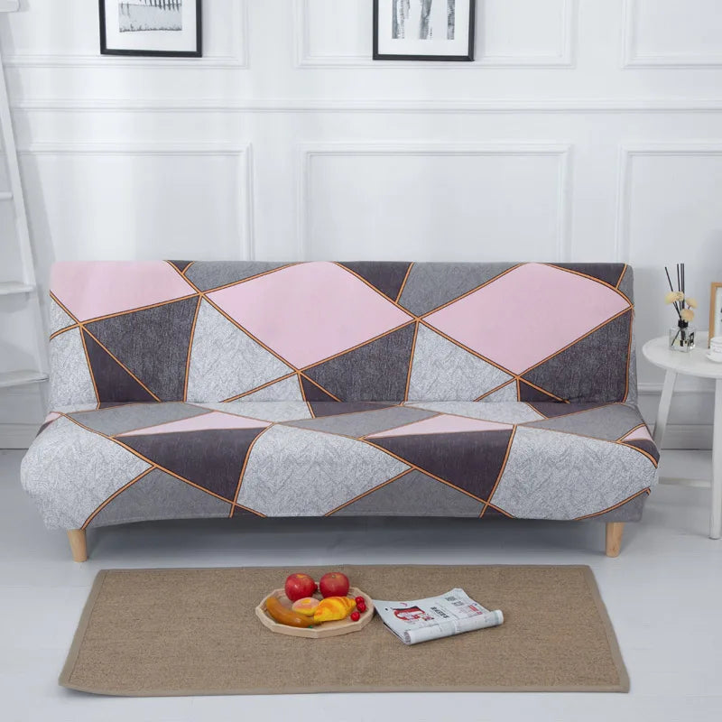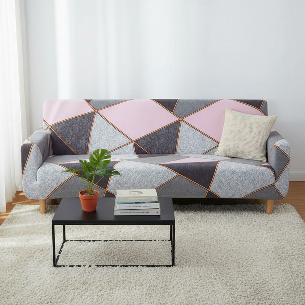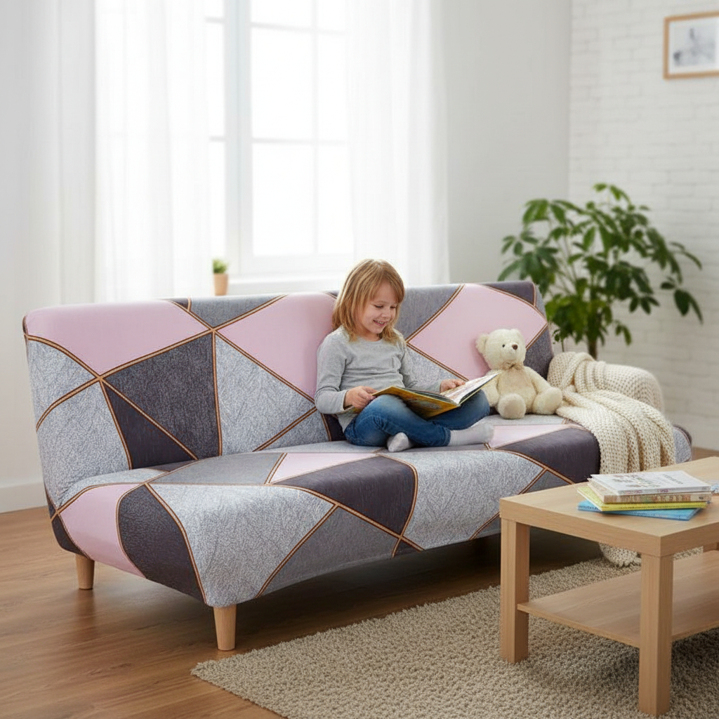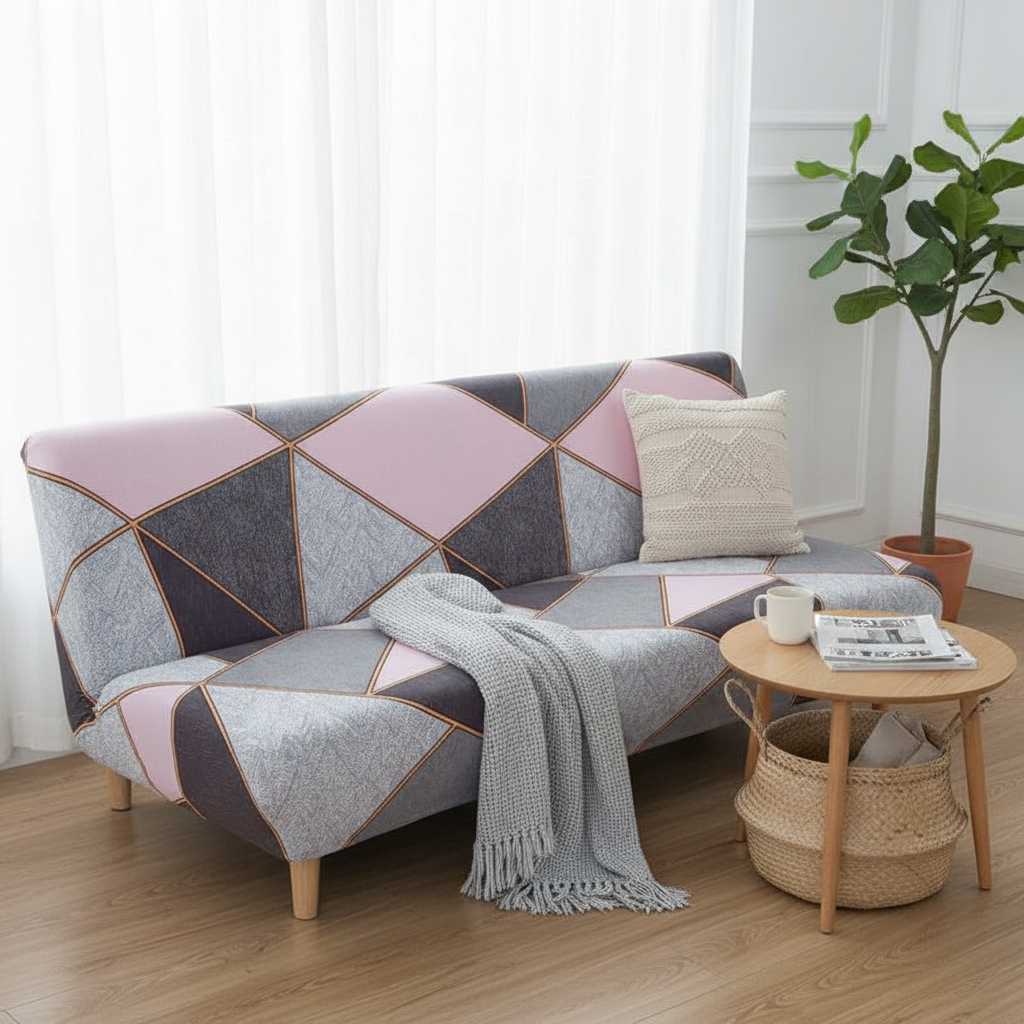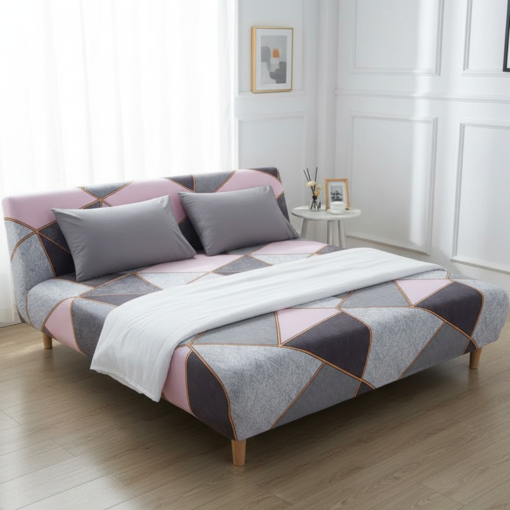 Transformez votre intérieur avec cette housse de clic-clac au motif géométrique moderne, mélangeant des teintes de gris, rose et des lignes orangées pour un style contemporain et vibrant. Confectionnée à partir d'un tissu tricoté extensible, elle offre un confort douillet et s'adapte parfaitement à la forme de votre canapé-lit, idéale pour les saisons printanières et estivales.