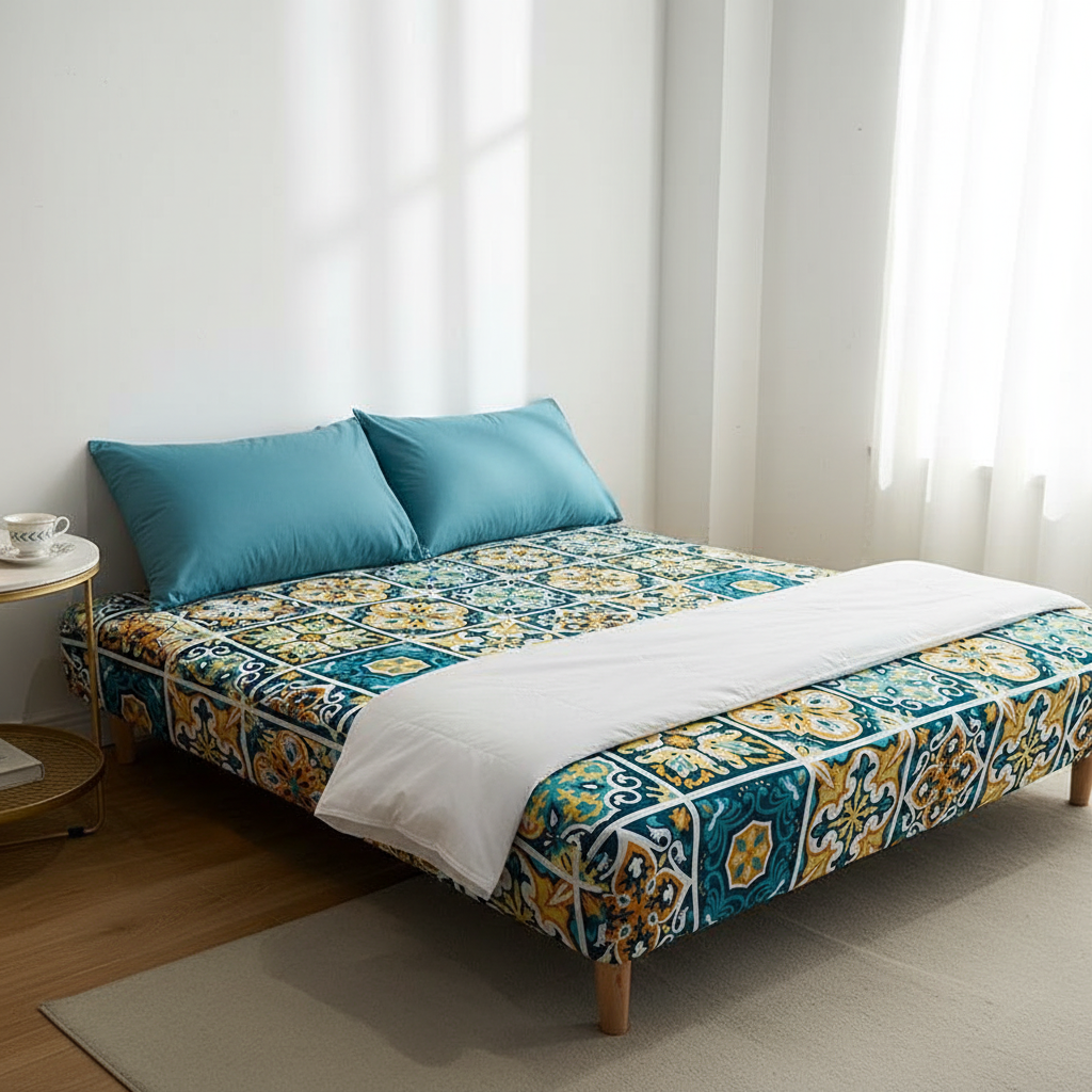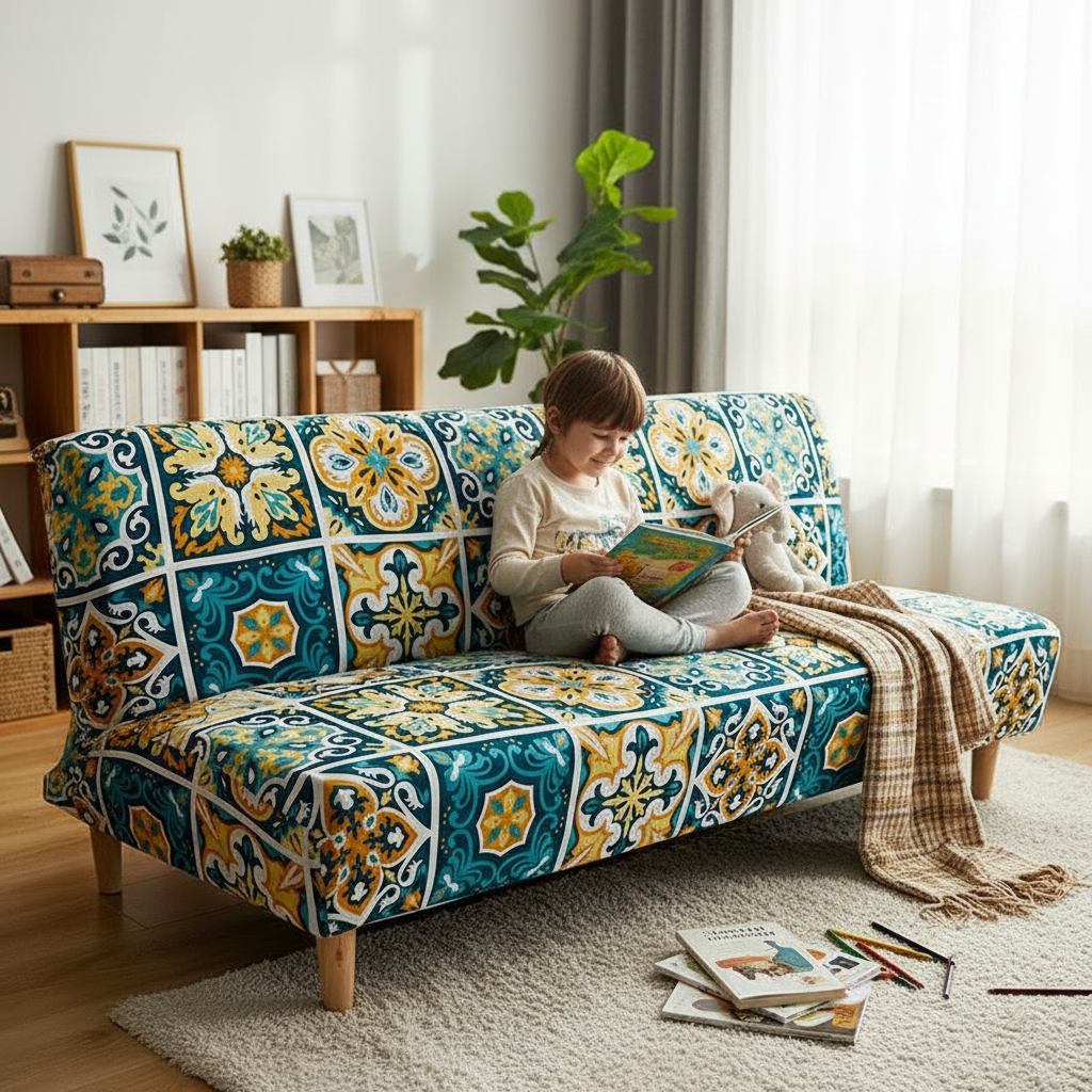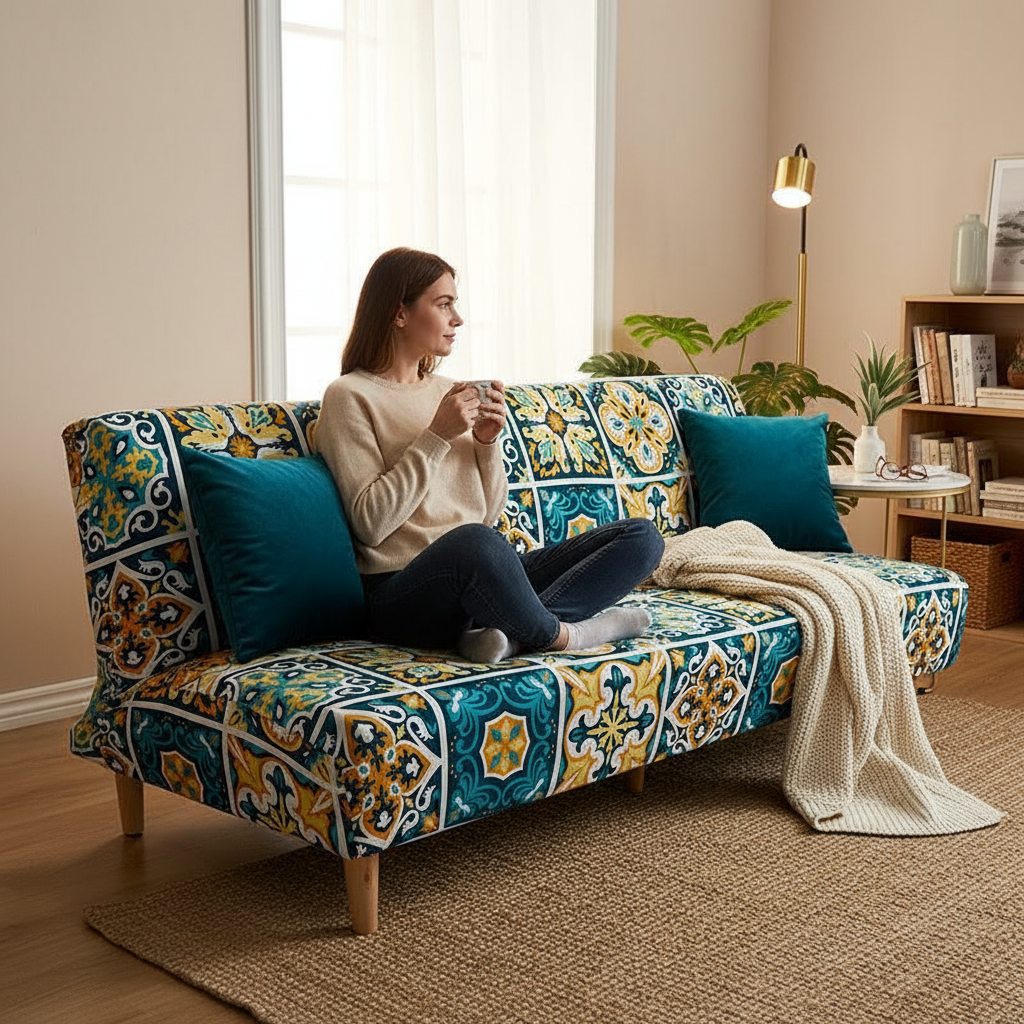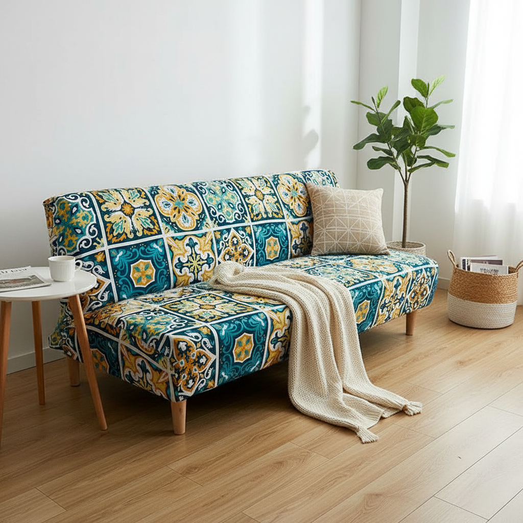 Transformez votre espace avec notre housse de clic-clac au style géométrique vibrant. Conçue en 100% polyester tricoté, cette housse extensible apporte une touche d'originalité inspirée du vintage tout en protégeant efficacement votre canapé-lit.