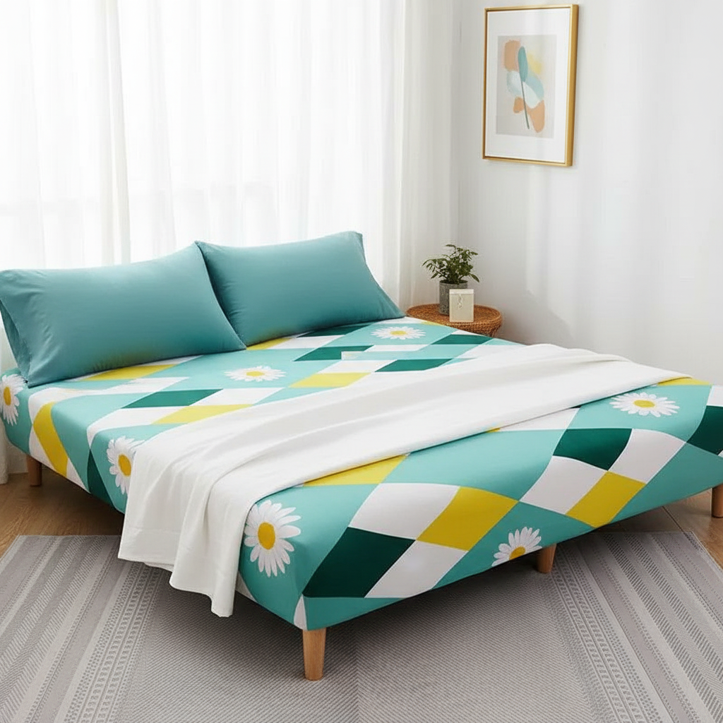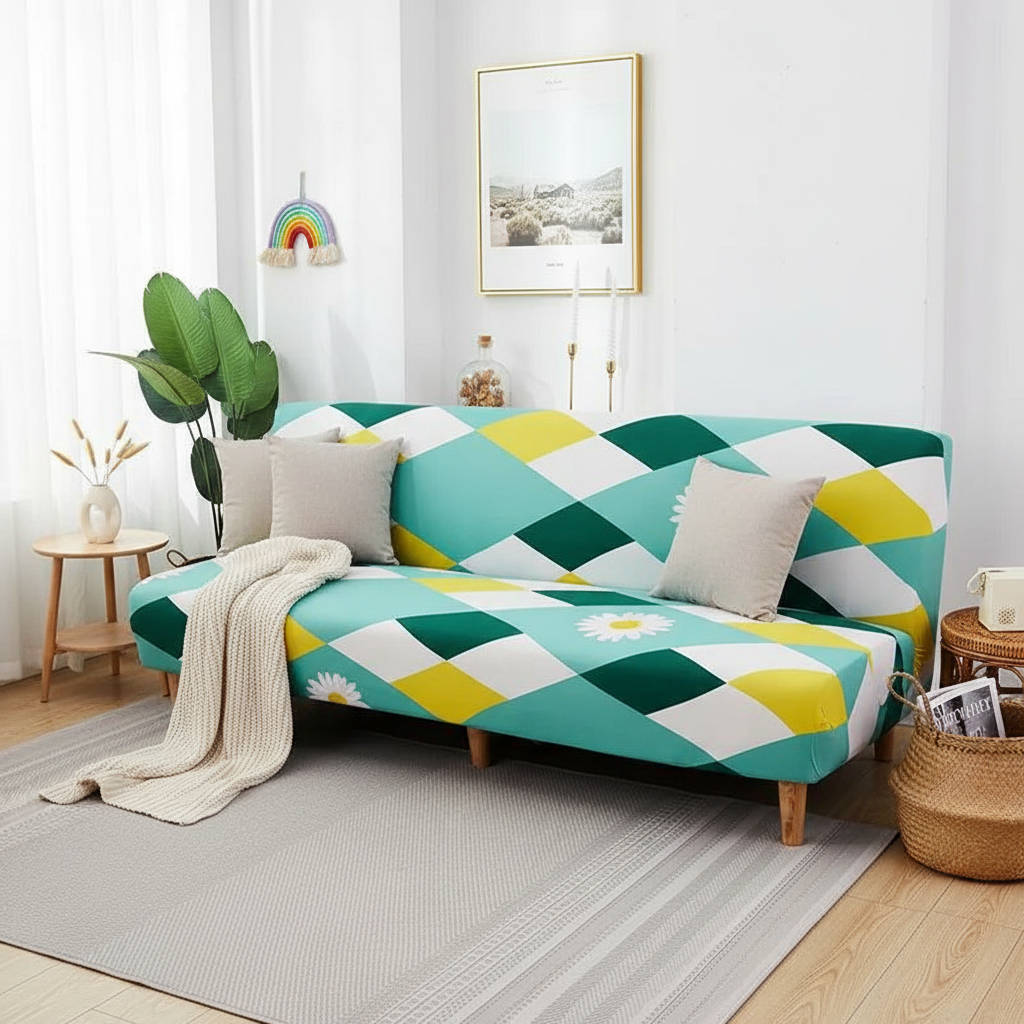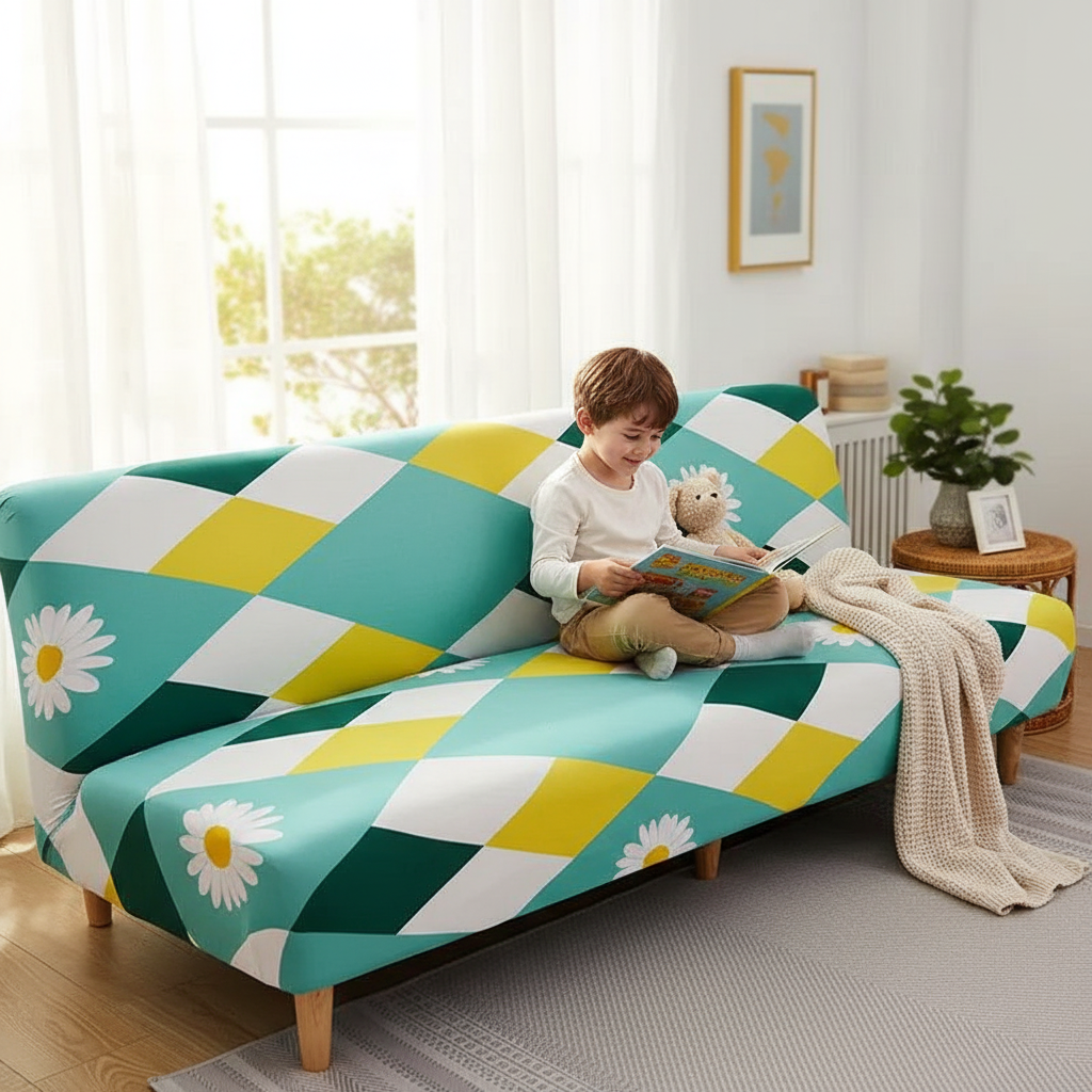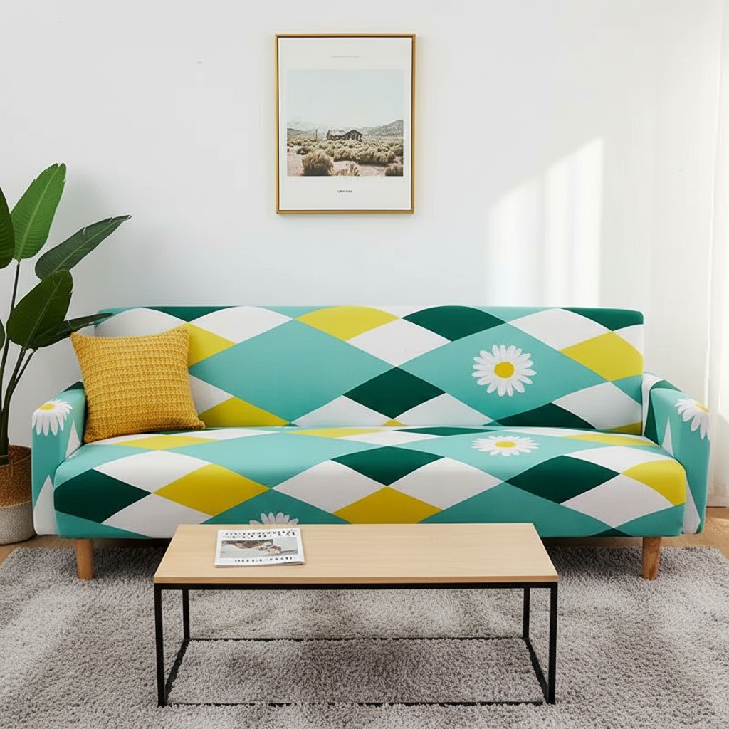 Offrez une nouvelle jeunesse à votre intérieur avec notre housse de clic-clac aux motifs de pâquerettes et losanges géométriques. Sa matière extensible, majoritairement turquoise, jaune et vert, apporte une touche de fraîcheur printanière tout en protégeant efficacement votre canapé-lit grâce à sa composition en 92% polyester et 8% de fibres extensibles.