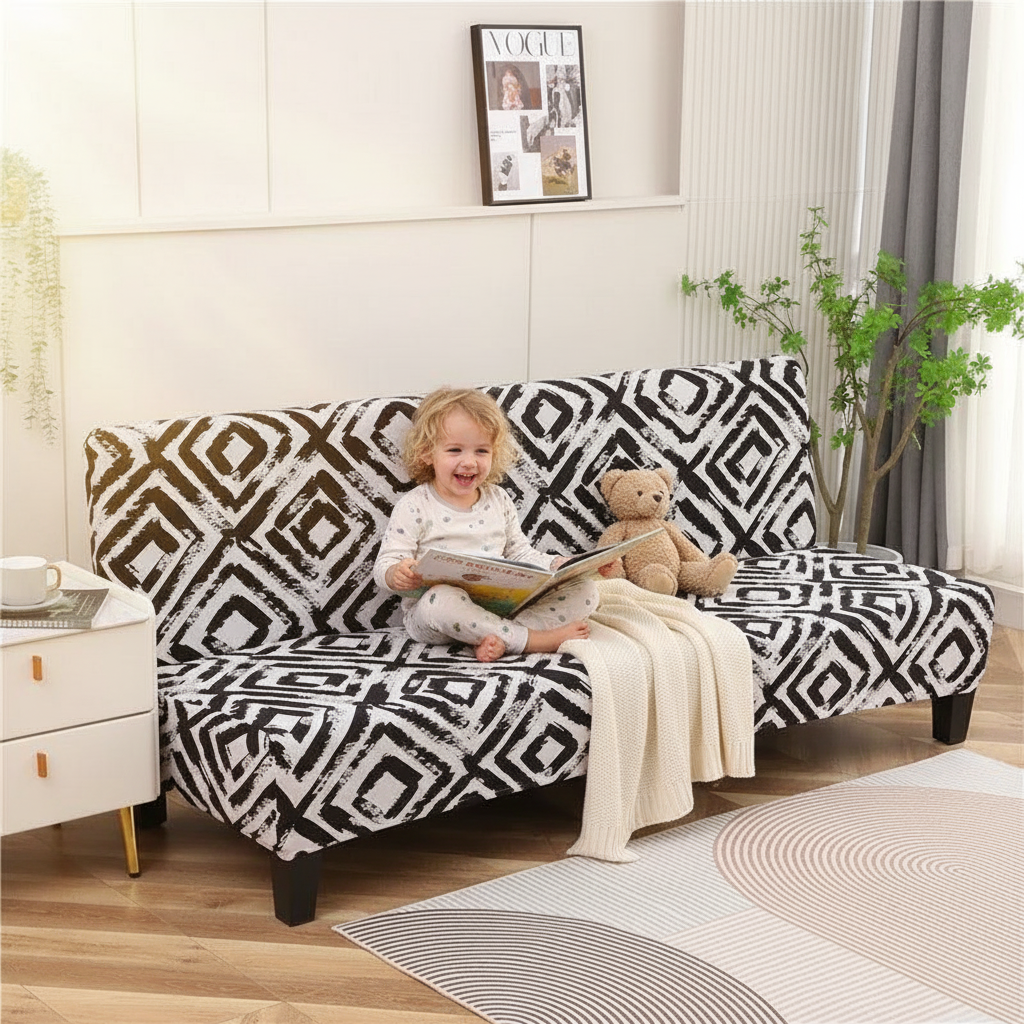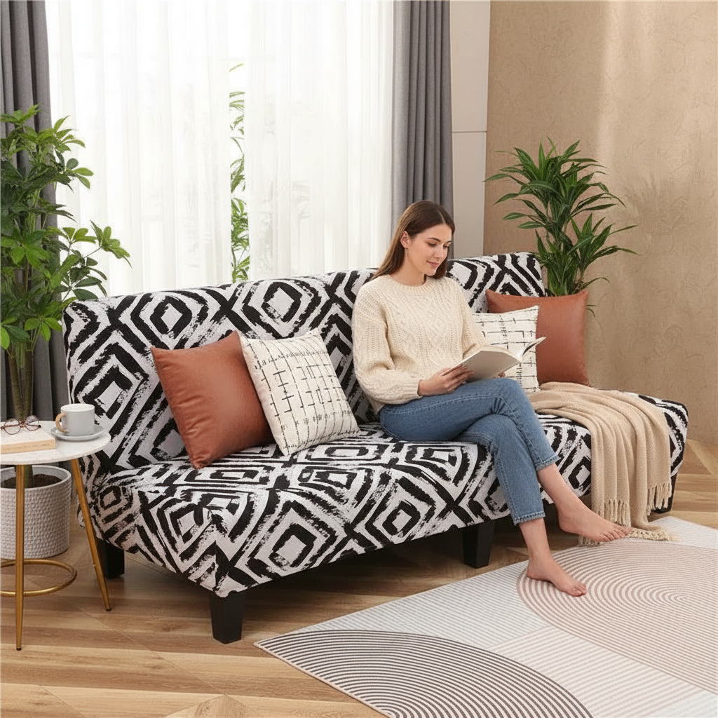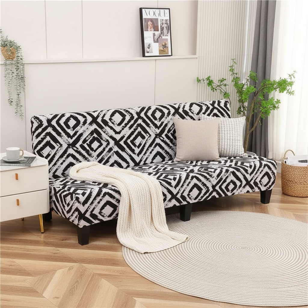 Notre housse de clic-clac transforme instantanément votre intérieur avec son motif géométrique noir et blanc. Conçue en polyester et spandex de haute densité (180gsm), elle offre une élasticité optimale et un confort durable pour toutes les saisons. C'est la solution idéale pour protéger et rafraîchir votre canapé-lit sans accoudoirs.