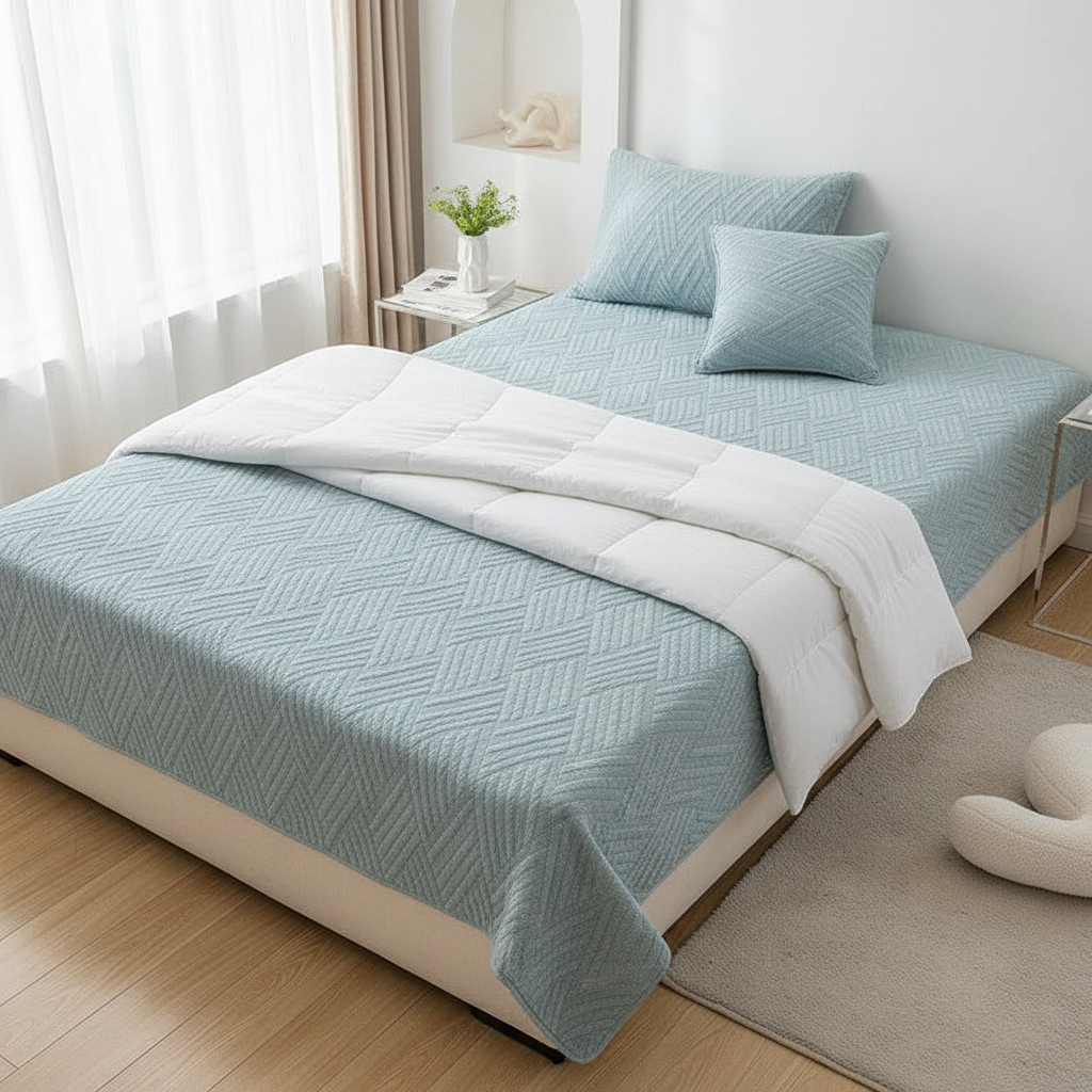 • Design matelassé : Un motif tissé par technique de tatting, pour une esthétique moderne et un toucher brossé.
